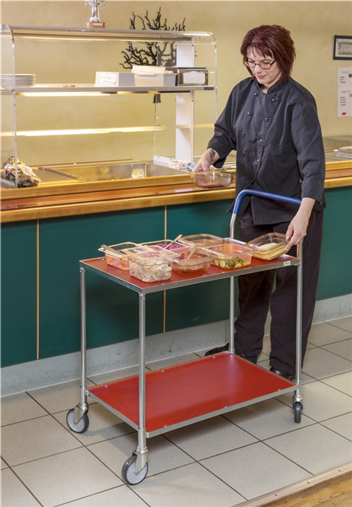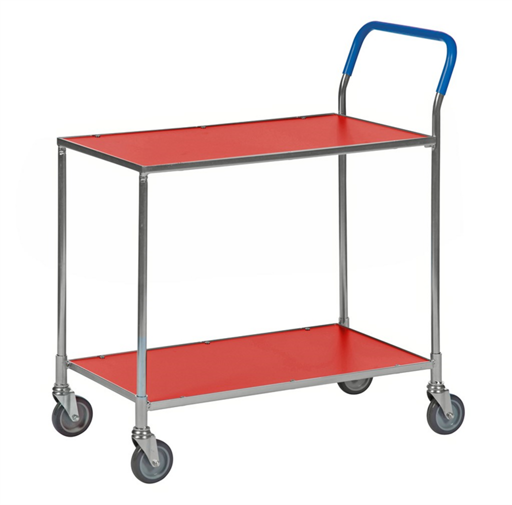 Elförzinkad med laminatskiva. Greppvänligt, plastat handtag. 2 hyllplan. Höjd till första hyllplanet: 180 mm. Avstånd mellan hyllplan: 510 mm. Maxlast hyllplan: 150kg (2x75) Hjul: 4 länk. Hjuldiameter: 100 mm.